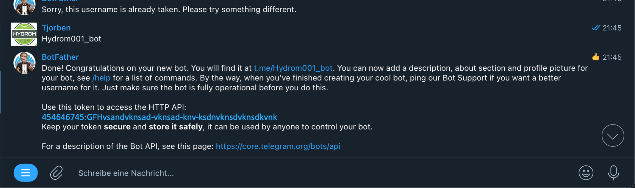 Es wurde ein Konto beim Messanger-Dienst Telegram eingerichtet.