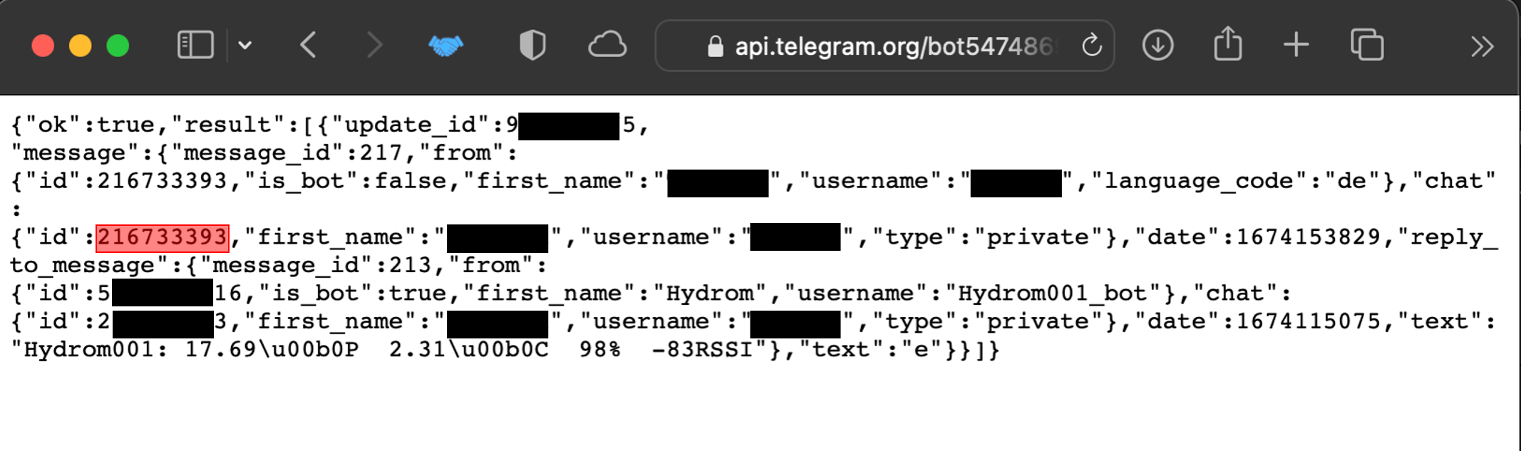 <figure><img src="https://1630777279-files.gitbook.io/~/files/v0/b/gitbook-x-prod.appspot.com/o/spaces%2FDmXnhyBLWoY3A2kYTbTH%2Fuploads%2Fgit-blob-b588d2a1f954ba626c32f8b80f947ae0b98e10ab%2FFolie51.png?alt=media" alt=""><figcaption><p>Antwort des api.telegram mit der ChatID</p></figcaption></figure>